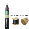 ADSS, cabo autossustentável totalmente dielétrico de única bainha, suas fibras são posicionadas em tubos soltos feitos de plásticos de alto módulo, preenchidos com composto de preenchimento resistente à água, os tubos e preenchedores são torcidos em torno de um elemento central de resistência não metálico FRP, depois em um núcleo de cabo compacto e circular. Após o núcleo do cabo ser preenchido com composto de preenchimento, o cabo é finalizado com uma bainha externa de PE ou AT (antirrastreio). O cabo pode ser instalado sem desligar a energia, o maior vão é superior a 100m.