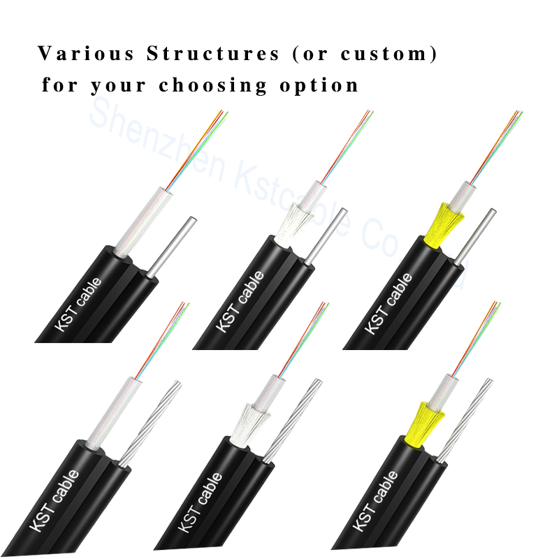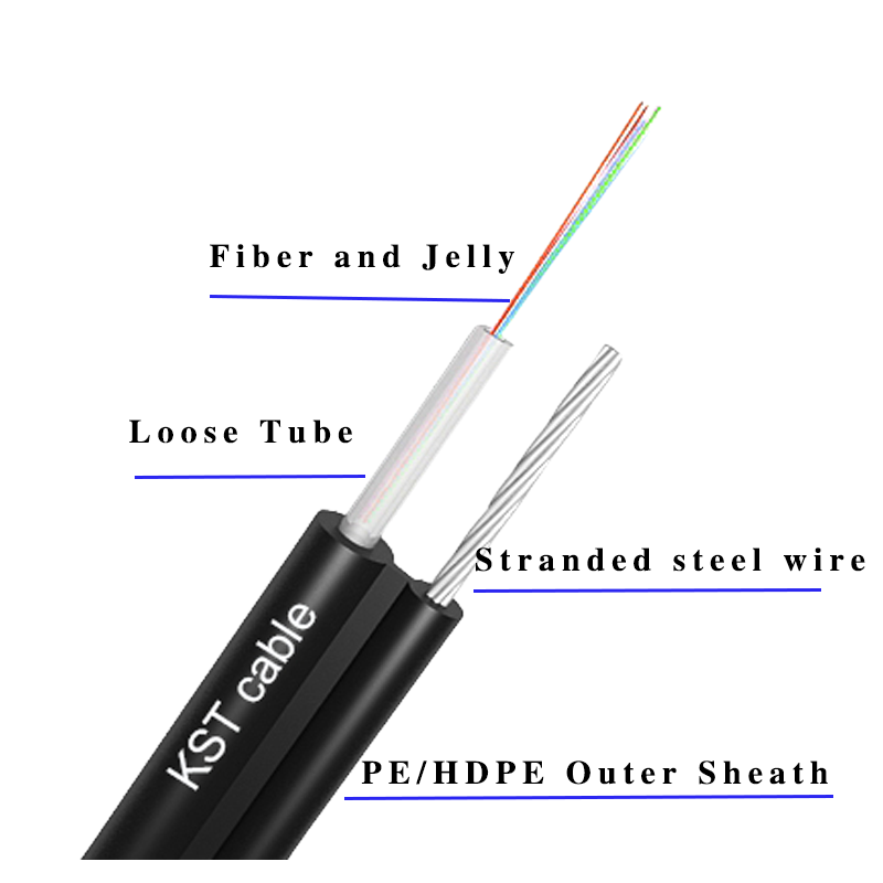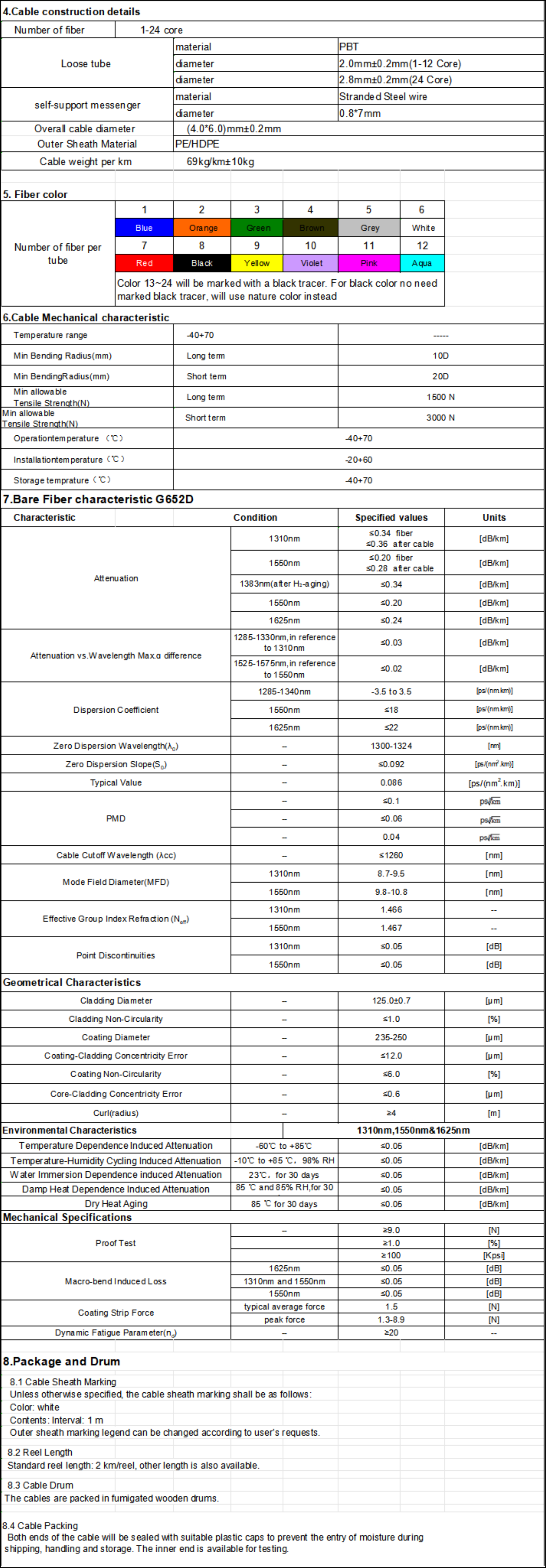 Juntamente com a parte adicional autoportante (fios de aço trançado de 0,8 mm * 7 cobertos com revestimento externo de PE/HDPE), o cabo tem uma estrutura de figura 8.
